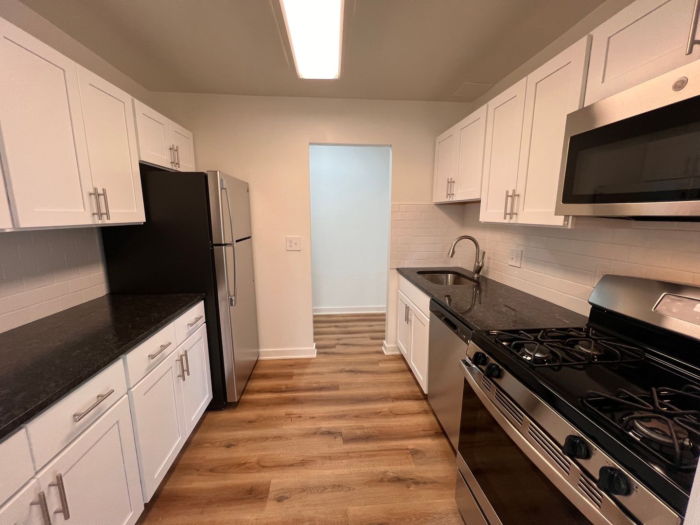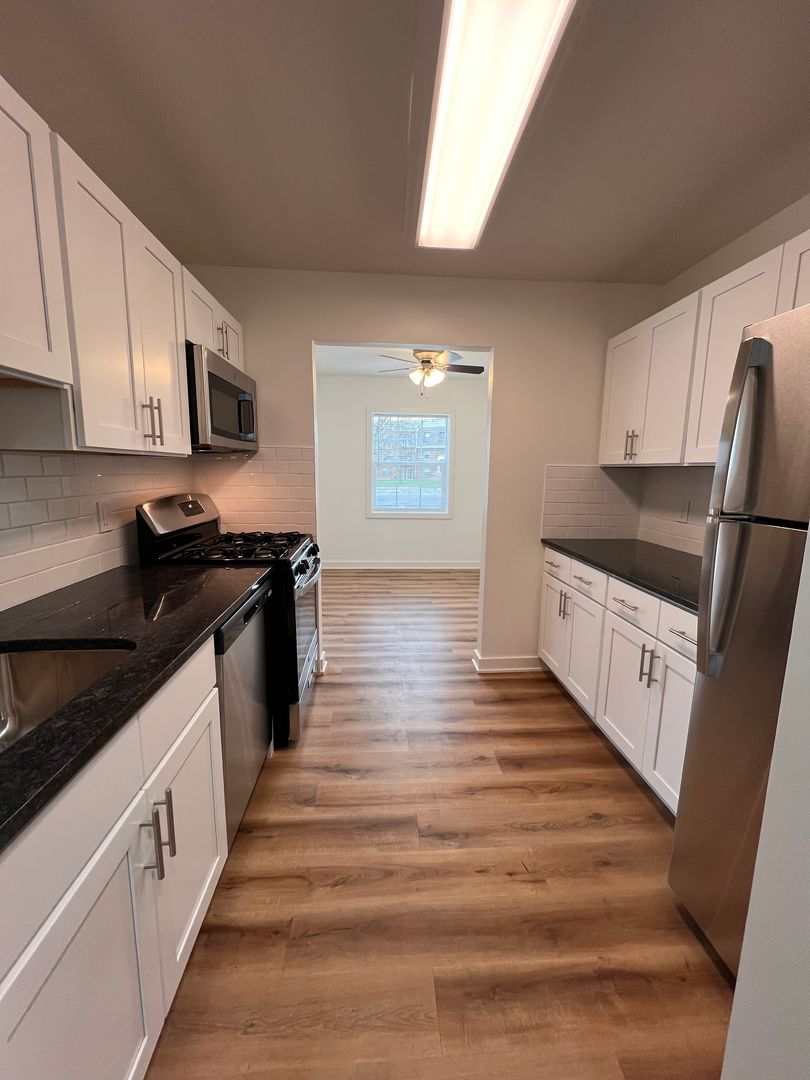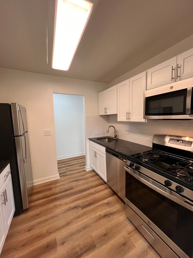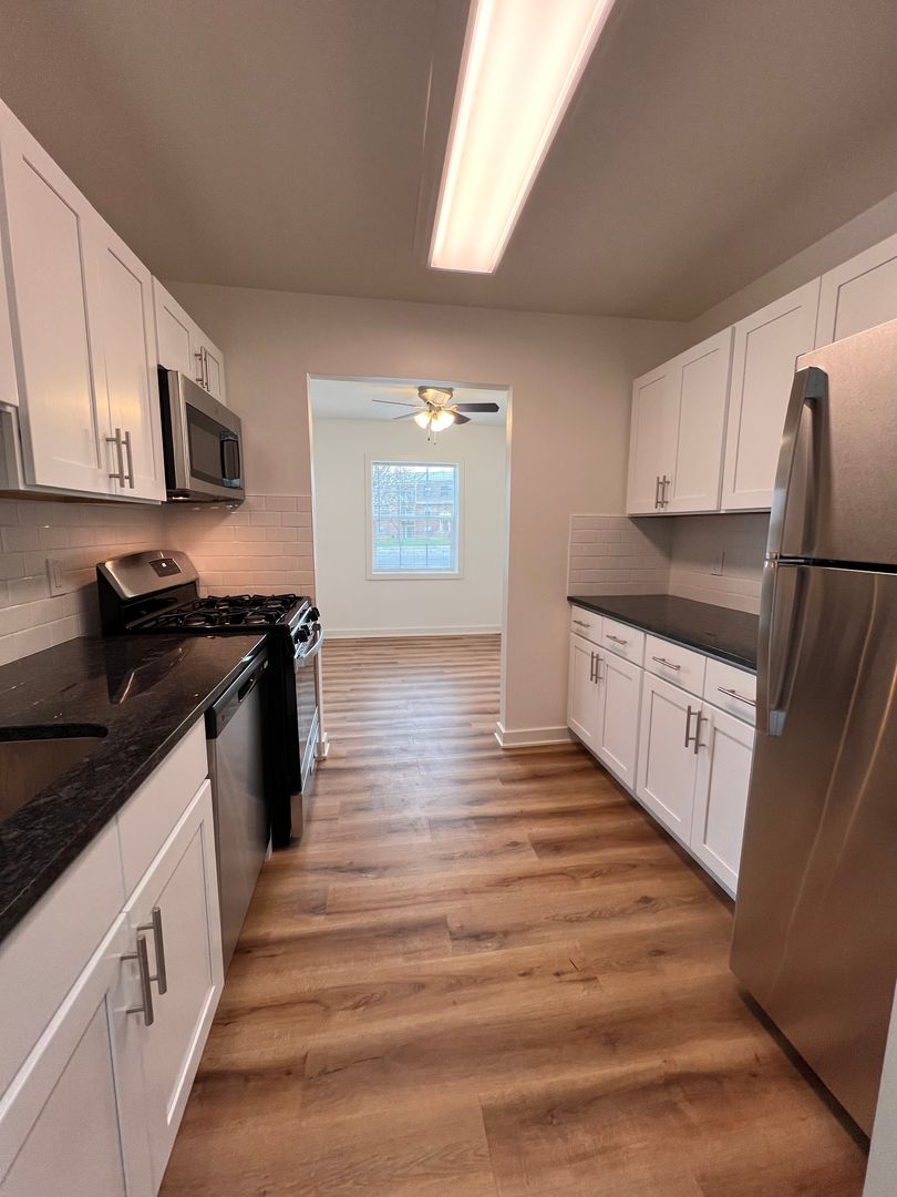 Prepare gourmet meals in a chef-inspired kitchen featuring crisp white shaker cabinetry, dark stone countertops, and a classic subway tile backsplash—all complemented by a full suite of stainless steel appliances. The main living areas boast beautiful wood-engrained LVP flooring and modern high-hat lighting, while the bedroom offers a cozy retreat with plush, premium carpeting.
